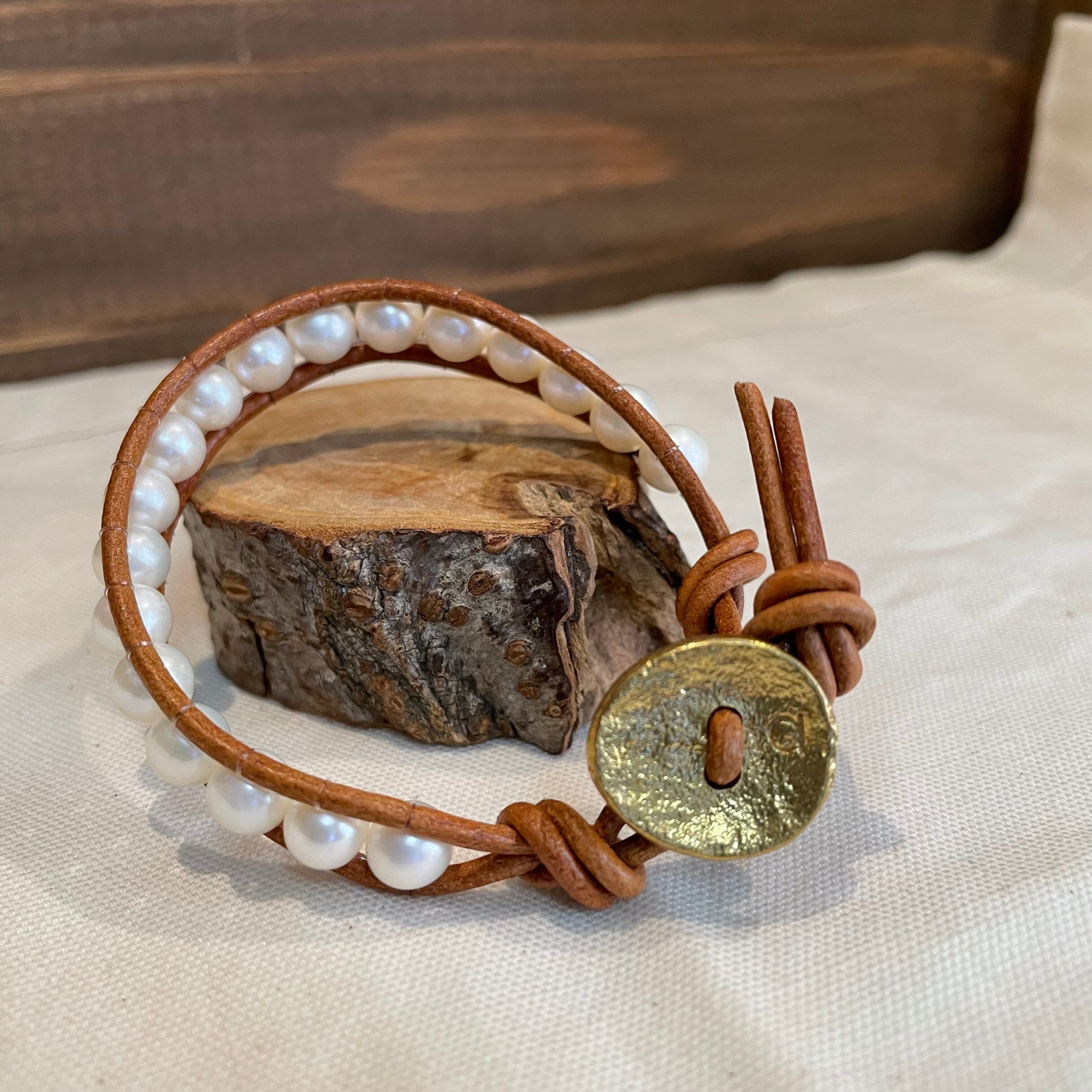淡水真珠を革ひもに編んだブレスレットです。留め具のボタンもオリジナルの物を使っています。