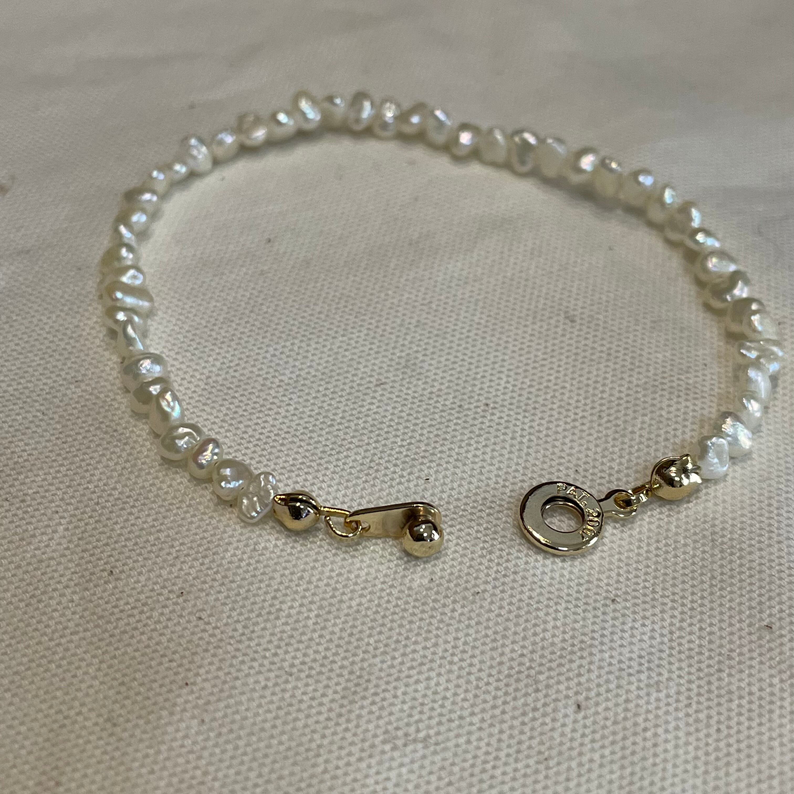 淡水真珠をPEテグスに通したブレスレットです。留め具はスナップボタン式の物を使っています。